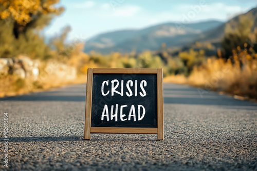 Crisis ahead message written on black board on empty road. Conceptual crisis ahead symbol. Copy space.