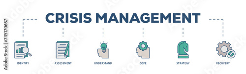 Crisis management icons process structure web banner illustration of recovery, strategy, understand, assessment, identify, cope icon live stroke and easy to edit