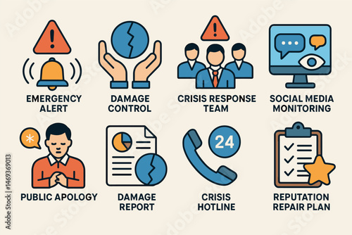 Crisis management icons set – flat, filled, damage control and emergency alerts