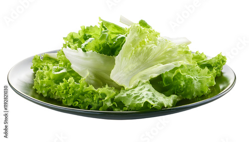 Crisp and vibrant green lettuce leaves arranged on a dark plate against a clean white background. Perfect for healthy lifestyle, vegetarian dishes, or food presentation concepts