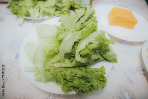 crisp green lettuce leaves and thin onion slices arranged on a white plate, with cheddar cheese slices visible in the background.