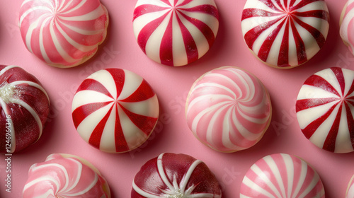 Crisp peppermint candy arranged on vibrant pink background, creating festive and cheerful atmosphere