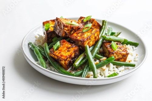 Crispy Air Fryer Chili-Garlic Tofu with Green Beans on Rice