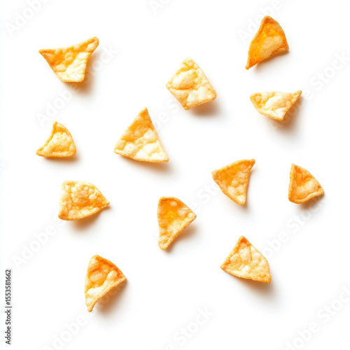 Crispy baked tortilla chips scattered on a clean white background