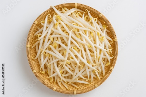 Crispy Bean Sprouts Presented on a Bamboo Tray for Cooking, Close-Up Shot on White Surface