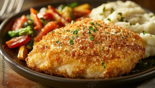 Crispy Breaded Chicken or Fish with Mashed Potatoes and Roasted Vegetables