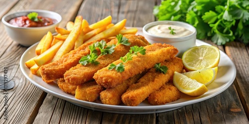 Crispy breaded fish sticks, golden fries, and a side of lemon wedges, all served on a white plate with dipping sauces