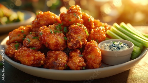 Crispy Buffalo Chicken Bites with Celery and Blue Cheese Dip.