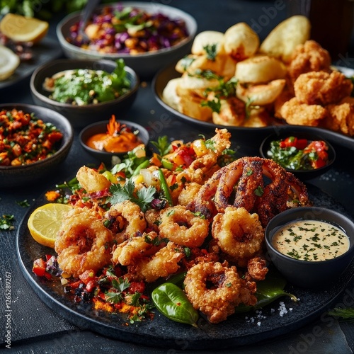 crispy Calamari with garnishes and sauces vividly visible