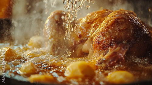 Crispy chicken being fried with potatoes in hot oil at a bustling kitchen