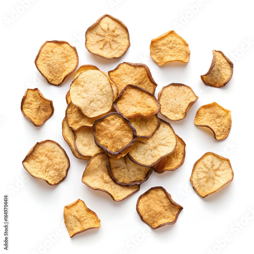 Crispy dried eggplant chips scattered randomly on white background, a healthy snack option