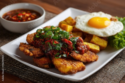 Crispy Fish Fingers with Spicy Sauce, Fried Egg, and Potatoes: A Vibrant Dish