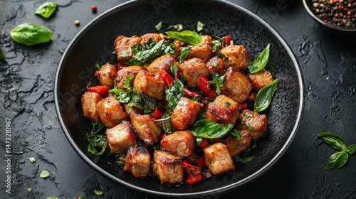 Crispy, flavorful pork cubes with herbs and red chilies in a dark bowl