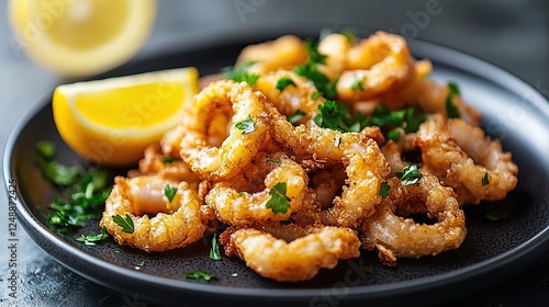 Crispy fried calamari rings, lemon, parsley, dark plate, kitchen background, food photography