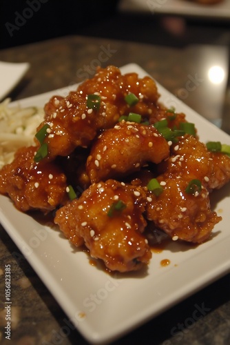 Crispy fried chicken coated in sweet sauce garnished with sesame seeds and green onions served on a plate in a dimly lit restaurant