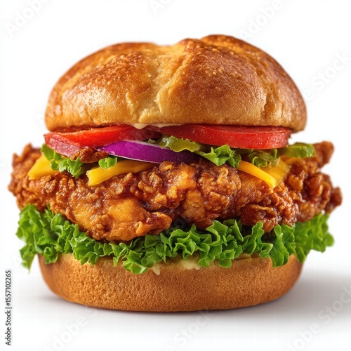 Crispy fried chicken sandwich with fresh vegetables and melted cheese in a soft bun served on a white background