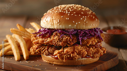 Crispy Fried Chicken Sandwich with Red Cabbage and Fries