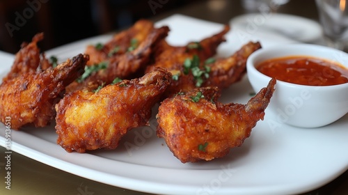 Crispy fried chicken wings served with a tangy dipping sauce.