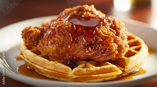 Crispy Fried Chicken with Waffles Topped with Sweet Syrup