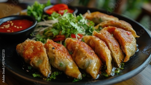 Crispy fried dumplings Gyoza with vegetables. Asian food.