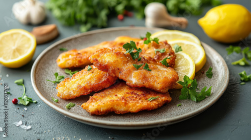 Crispy fried fish fillets garnished with lemon and herbs on a rustic plate during daylight