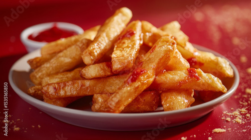 Crispy Fried French Fries with Ketchup on White Plate Delicious Snack Close-up with Red Background