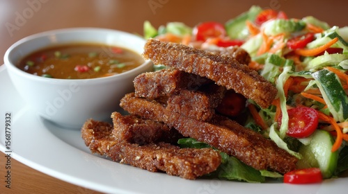 Crispy Fried Meat with Fresh Salad and Tangy Dipping Sauce