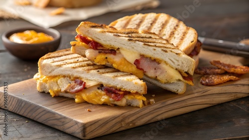 Crispy Golden Breakfast Panini Packed With Juicy Chicken, Melted Cheese, And Smoky Bacon, Creating A Hearty And Flavorful Fast Food Favorite For A Perfect Morning Boost