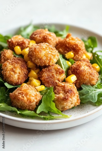 Crispy Golden Corn Fritters Served on a Bed of Fresh Arugula with Sweet Corn Kernels Garnishing the Plate