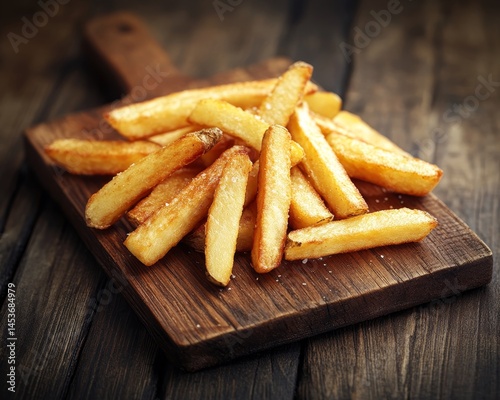 Crispy Golden French Fries on Rustic Wooden Platter, Delicious Fast Food Snack or Side Dish