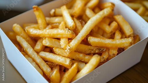 Crispy, golden French fries served in a paper tray, highlighting their crunchy texture and soft interior, a beloved classic fast-food snack for any occasion