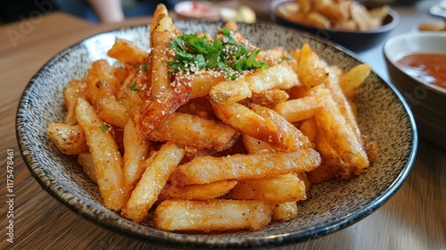 Crispy Golden French Fries Served on a Plate, Garnished with Fresh Herbs for an Indulgent Treat