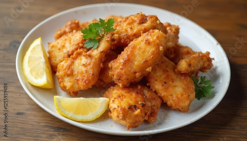 Crispy golden fried chicken pieces served with fresh lemon wedges