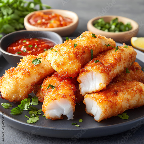 Crispy Golden Fried Fish Sticks with Fresh Herbs and Dips
