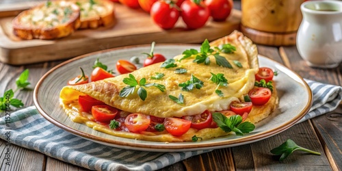 Crispy golden fried omelette with melted cheese and juicy tomatoes on a plate in a cozy kitchen setting, breakfast meal, greasy food
