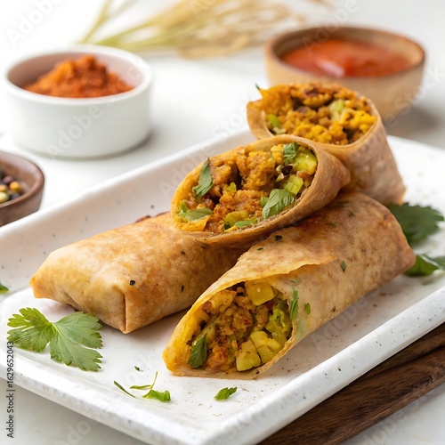 Crispy golden fried spring rolls filled with vegetables and spices served with dipping sauces