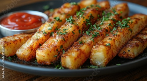 Crispy golden potato fries seasoned with parsley, served with ketchup on a dark plate.
