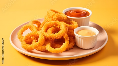 Crispy onion rings with dipping sauces kitchen background gourmet food photography bright environment close-up view