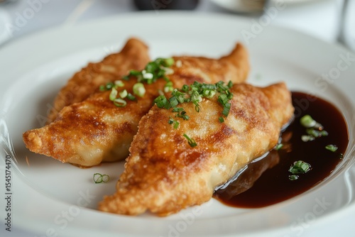 Crispy pan-fried dumplings are garnished with green onions and soy sauce. Use this image to illustrate Asian cuisine or appetizer recipes online.