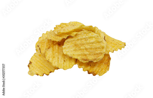Crispy potato chips isolated on white background. Tasty fried potato slices in closeup