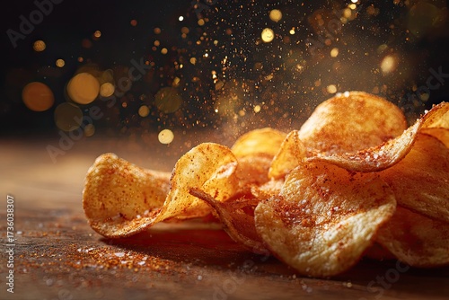 Crispy potato chips, seasoned, spilling onto a wooden surface with golden light and splashes