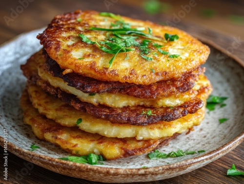 Crispy potato pancakes stacked on a plate garnished with fresh parsley on dark rustic wood table