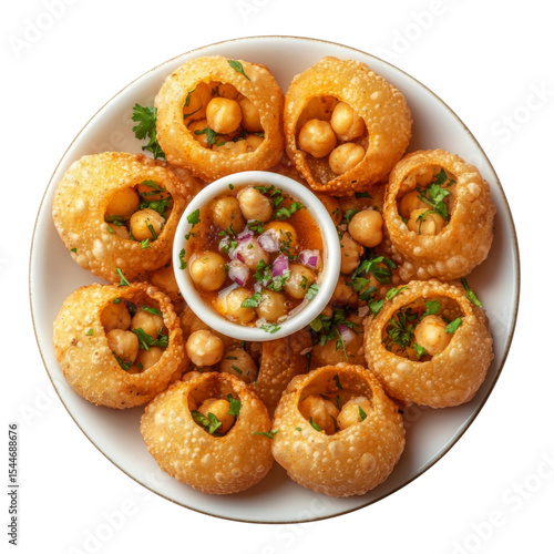 Crispy puris filled with chickpeas and spices, served with tangy sauce. popular street food dish, bursting with flavor and garnished with fresh herbs