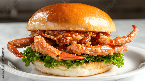 Crispy Soft Shell Crab Sandwich on Fresh Lettuce with Glazed Sauce and Golden Bun