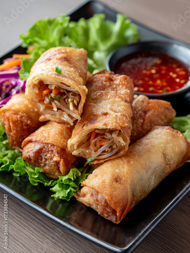 Crispy spring rolls with dipping sauce on a lettuce bed.