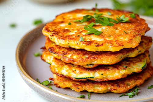 Crispy zucchini fritters with fresh herbs on pastel lavender plate