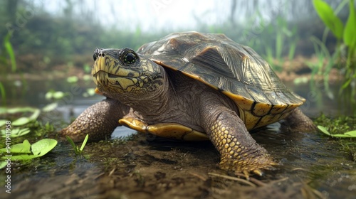 Critically Endangered Yangtze Turtle Navigating Murky Waters, Large Shell Interaction, Essential Ecosystem Advocate