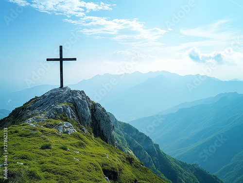 croce cristiana sulla cima della montagna , paesaggio mozzafiato concetto di salvezza e risurrezione