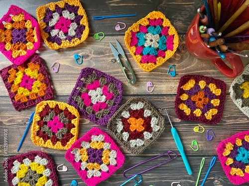 Crochet granny square and objects for knitting and crocheting handmade cozy photo hobby handiwork