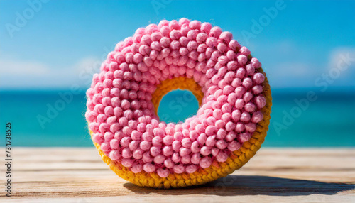 Crocheted donut toy vibrant backdrop, handcrafted and adorable